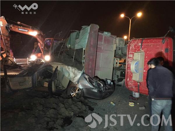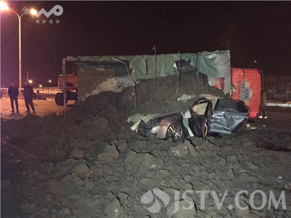 3月11日凌晨一点在栖霞区白水桥红绿灯口,由西向东方向,一辆起亚SUV被一辆迈腾轿车追尾,迈腾上女司机涉嫌酒驾,双方下车拍照报警,这时一辆满载的渣土车因为车速过快避让事故现场猛打方向引发侧翻,压住迈腾轿车,事发现场四人被渣土车撞击受伤,都有不同程度骨折现象,送省中西医结合医院治疗。幸亏当时都在车外,否则被压后果不堪设想,清障车现场清理大约2:30路面清理完毕。目前交警七大队正在调查处理。