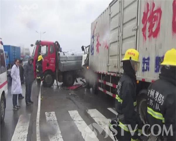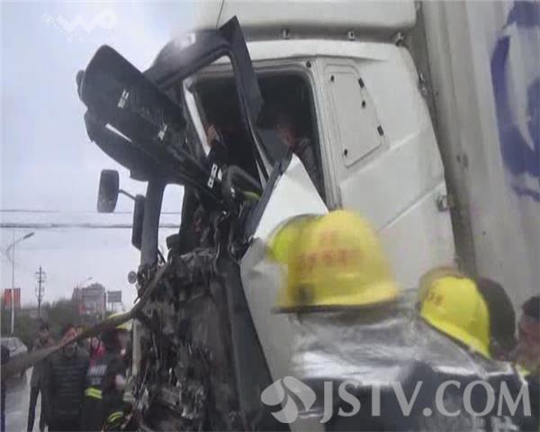 消防到场后发现一辆自西向东方向的白色箱式货车与一辆南北方向行驶的红色货车相撞,车头严重变形,驾驶员腿卡在方向盘下方,无法脱身,副驾驶上一名女子并未受伤。