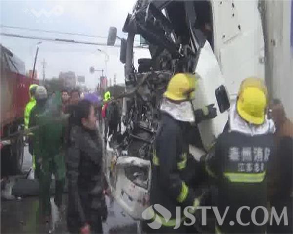 3月9日15时许。泰州消防指挥中心接到报警称,姜堰区淤溪镇靳潭村兴泰公路车祸有人被困,区消防队立即车赶赴现场。