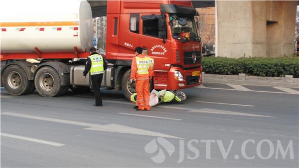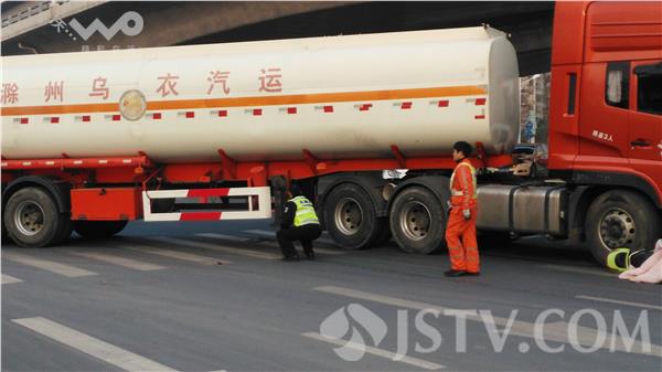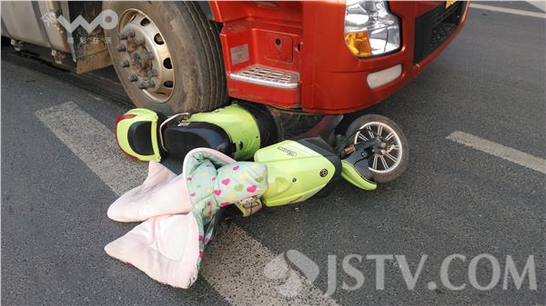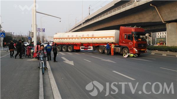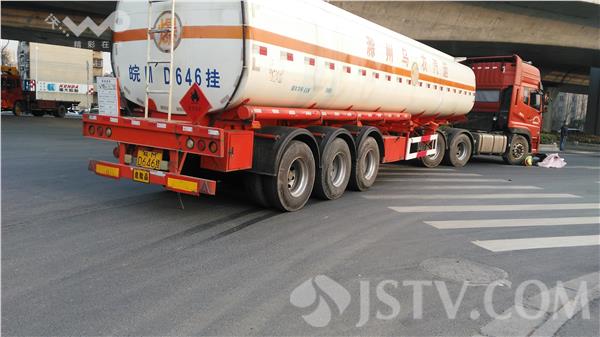 据围观市民称,要不是电瓶车挡住汽车前轮后果不堪设想。据当事人讲,当时槽罐车和骑车女子从晓山路同时右拐弯上江北大道,也没注意女子怎么突然跑到槽罐车上前面。