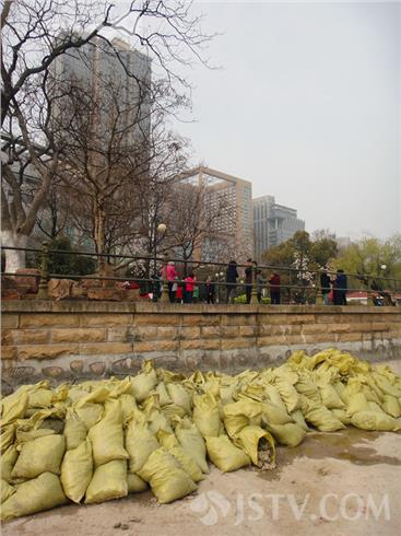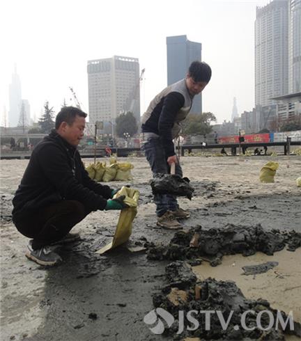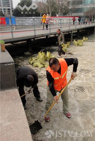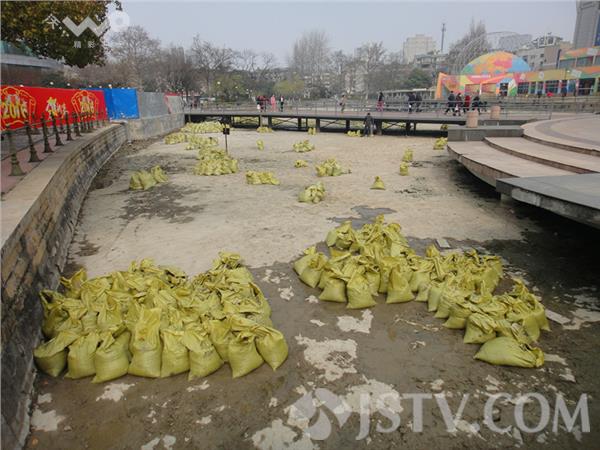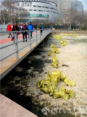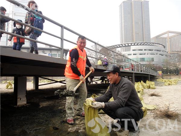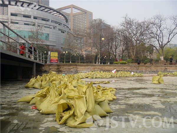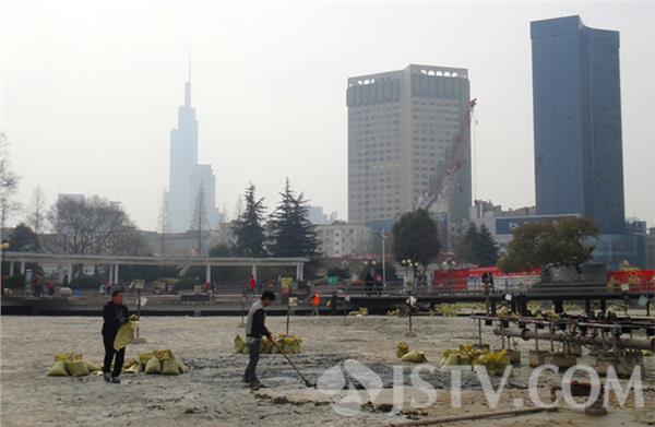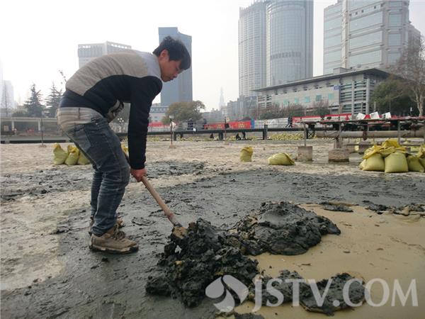 今天(3月15日)中午,荔枝新闻网友在南京山西路附近的西流湾公园看到,受湖南路山西路管委会的委派,数十名民工正在忙碌着对公园景观湖的湖底进行全面清淤。民工们将公园池内积存多年,厚厚的淤泥用铁锹铲起,一一装入塑料袋内,准备让其凉干后装运拖走。