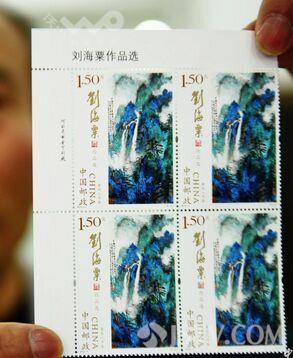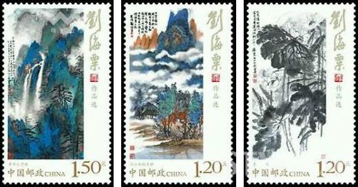 在刘海粟诞辰120周年之际,3月16日,中国邮政发行了《刘海粟作品选》邮票,全套为三枚,分别为《江山如此多娇》《墨荷》《黄岳人字瀑》三幅经典画作,其中前两枚面值均为1.2元,第三枚面值1.5元。
