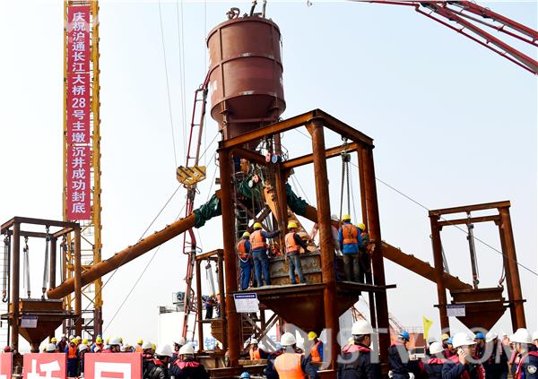 3月16日,从南通海事局获悉,有“世界最大桥梁基础”之称的沪通长江大桥28号主塔墩,今起正式转入为期三天不间断的沉井封底作业。预计将近6万方混凝土倾注而下,构筑起面积约为12个标准篮球场、厚度达到14米的水下庞然大物,为28号主塔墩打造史上最坚实的基座。