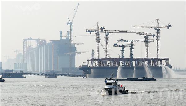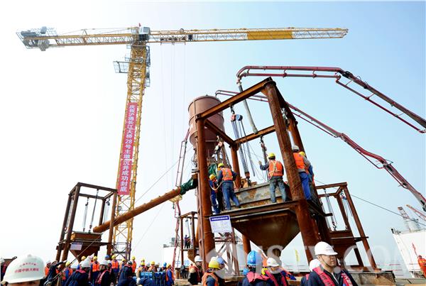 据了解,“28#墩钢沉井全重近15000吨,面积5000余平方米,高达44米,有十几层楼那么高,远远望去就像一块巨型的蜂窝煤状‘大铁块’。”此次沉井封底共分为“碎石填孔”“灌注第一批封底混凝土”“井孔排石”“灌注第二批封底混凝土”四个阶段,最终将28号墩灌注至设计标高,完成封底作业。
