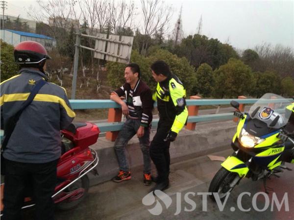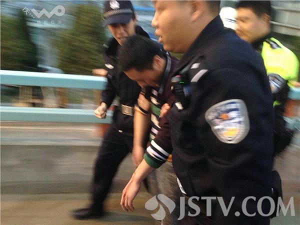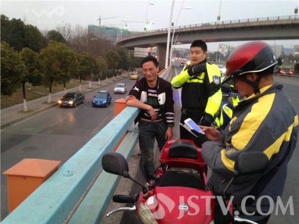今天,3月16的交通晚高峰期间,南京双桥门立交水泄不通,南京交管局机动大队及时根据车流情况调整警力部署,将巡逻警力调至双桥门疏堵保畅。18时许,指挥中心接报,双桥门立交北向南方向有一男子神情异常沿桥面行走,接报后,机动大队两名巡逻警力一起前往查看情况,寻至卡子门立交至机场连接线段发现一男子坐在高架护栏外,大队民警迅速分工,赵培伟隔离出一股车道、邓凯前往查看情况,邓凯发现该男子手持玻璃茬已经将左手腕割破,血流不止,一名热心群众已抱住该男子左臂,这时消防救援车也抵达桥下,邓凯迅速上前控制住右臂,抱住该男子上身,随后呼叫赵培伟支援,三人完全控制住轻生男子后,邓凯夺下玻璃茬防止其伤害自己或是伤害到三个施救人员,随后三人齐心合力将轻生男子抱回桥面,险情暂时得到控制!