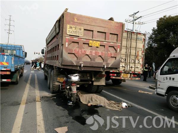 昨天(3月15日)下午3点多,在扬州邗江路与华阳路交叉口,一辆渣土车在华阳路路口等待红绿灯十多秒后,一辆摩托车在后面突然追尾上来,摩托车手当场死亡,后座男子送医院治疗。