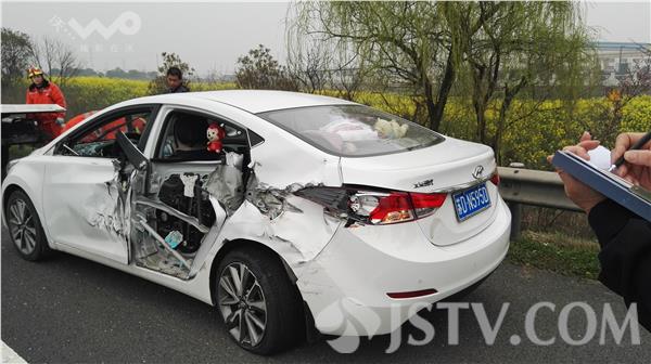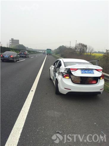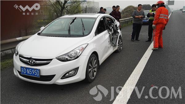 今天下午一时许,准新郎薛某驾驶刚从4S店保养出来的苏D号牌的轿车从金坛到淮安,他自己定于3月20日结婚,准备亲自去淮安将新娘接到金坛。当车辆行驶到扬溧高速公路31公里附近,薛某感觉车辆右后轮有异响,尽管距离上党收费站仅一公里,薛某还是将车停在应急车道上准备下车检查。薛某向民警反映:他刚下车打开双跳灯,打开后备箱门准备取出警示标志,没想到这时一辆山东号牌的半挂车直朝他车辆左侧撞来,他急忙闪到一边,再看车子左后门不翼而飞,而半挂车则停在前面一百米左右应急车道上。万幸的是事故没有造成人员伤亡,如果受伤这婚是肯定结不成了,薛某心有余悸。