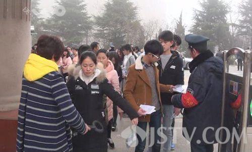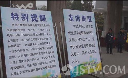 早上7点40分左右,荔枝新闻通讯员赶到射阳县高级中学考场时,考生们正在排队接受保安人员的检查,防止有人携带手机等电子产品进入考场,大门口的右侧,也摆放了一块醒目的提醒牌,提醒广大考生不要携带具有发送、接受信息功能的电子设备,执勤保安在旁边也不时提醒携带手机的考生,将手机交到值班室保管。在门卫值班里,面对记者的询问,一名正在登记的考生告诉记者,虽然老师提醒过他们,不要携带手机等电子产品,但他们有时也需要和他人联系。8点15分左右,距离开考时间还有十五分钟,一名家长带着考生匆忙来到考场门口,在没有携带无任何证件的情况下,要求进入考场参加考试,被保安拒绝后,家长电话与学校老师取得联系,才得知是跑错了考场,随即,该名家长与考生搭乘出租车赶到两公里外的另一考场,在老师那里领取了准考证,顺利参加考试。