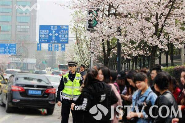 据了解平均每朵樱花的花期只有三天,这使得樱花短暂的盛开尤为珍贵。面对摩肩接踵的赏花人流,南京交警一大队民警自早上7点起开始对鸡鸣寺路全线安置水码隔离上下山方向人流,在台城大厦、北京东路成贤街路口、解放门三处地点实行圈外机动车交通管制。从市府路一直到台城,赏花的人流络绎不绝。上午10时起,根据现场人流量爆棚实际状况,及时在门前路牌坊及解放门处控制非机动车进入。现场参与执勤的民警和警辅连续工作,岗位上就餐,警车上调整,文明劝导、热情服务,有力保证了鸡鸣寺路上下一公里,数万游客的交通出行安全。