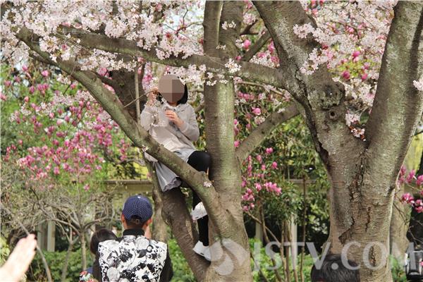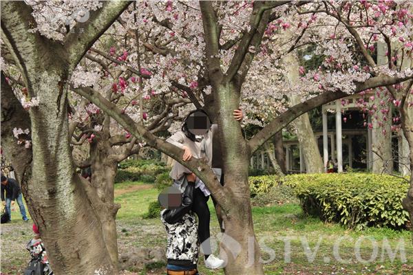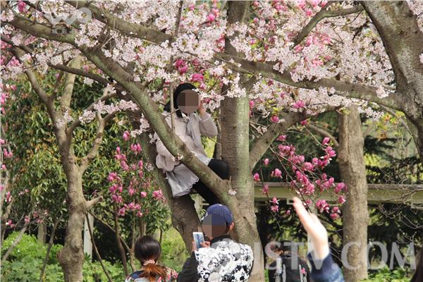 时下天气渐暖,春意盎然,公园成了市民踏青休闲的好去处,恰逢樱花盛开的日子,大家纷纷走出家门感受春的气息。可是人一多,不文明现象也多了起来。昨天(3月20日)正好又是休息日,市民携家带口前来欣赏樱花,不少游客赏花拍照。然而一些游客光看还不满足,把手伸向了樱花树上。有几个青年男女旁若无人地摘花,实在大煞风景。更加离奇的是一些孩子家长,纵容孩子爬到树上面拍照留念,有的树太高爬不上去,甚至家长还来帮忙。