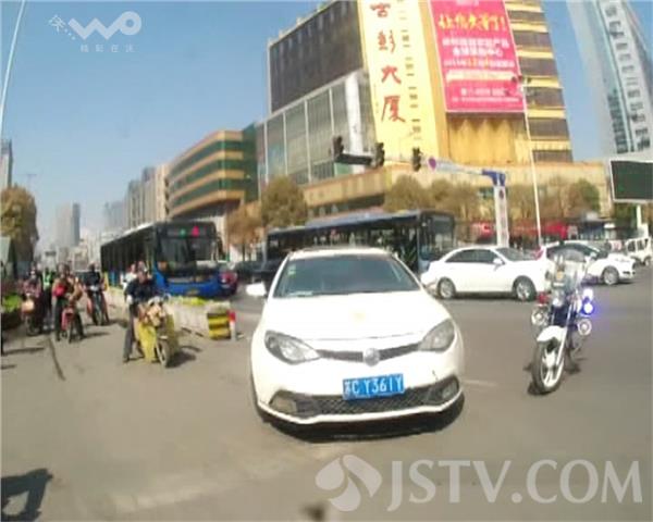 中午,泉山交警大队民警在淮海西路执勤时,发现这辆白色轿车走公交车专用车道,当示意其靠边停车的时候,驾驶员竟然变到左转弯车道又闯红灯直行,从民警身边擦身而过,袁警官拽到车门驾驶员都没有理睬,交警立即用对讲机联系下个路口将其拦停。