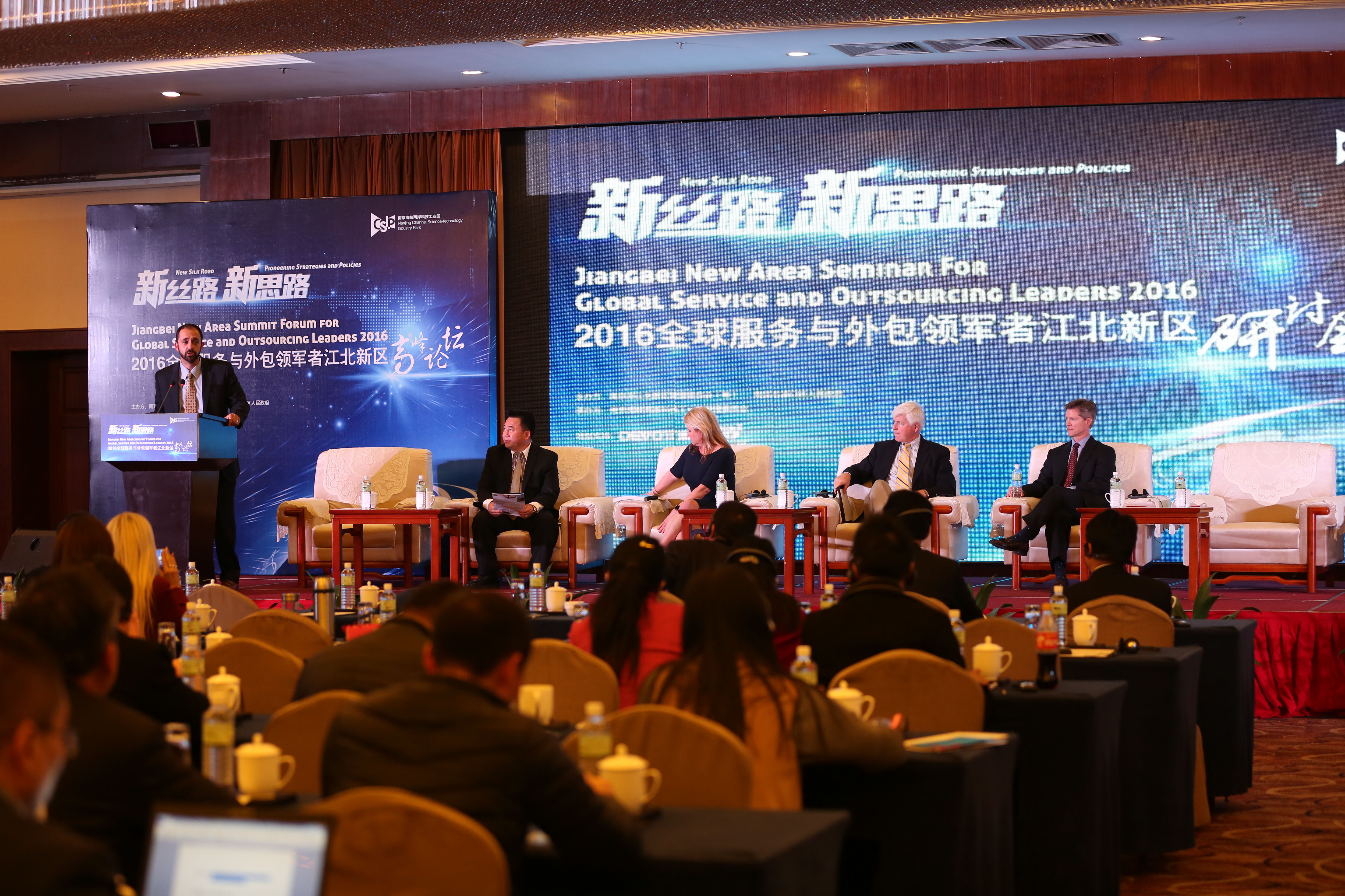 据介绍,自从江北新区成为国家服务贸易创新试点的消息传出,国内外服务贸易企业对江北新区在服务贸易领域的创新发展充满期待。本次研讨会一改由国内服务贸易接包企业为主体的格局,邀请了众多国际服务贸易的源头发包方,美国服务外包集团、英国服务外包协会、拉丁美洲服务出口国协会、印度软件和服务业行业协会等国际组织与省市知名服务贸易企业一道讨论了服务贸易在江北新区创新发展的策略与路径。