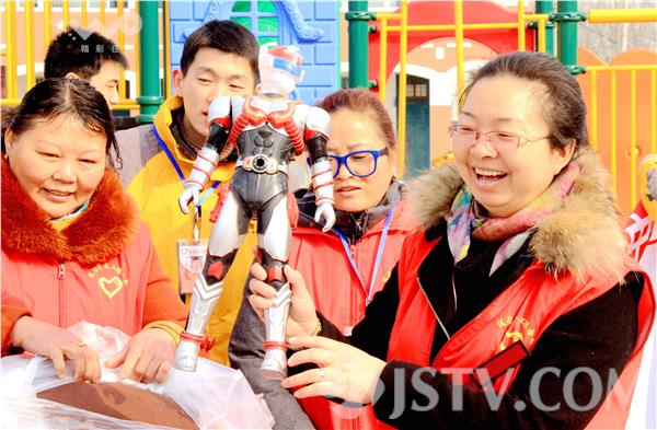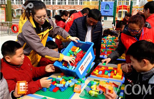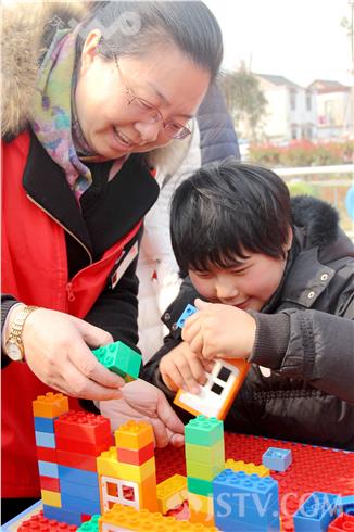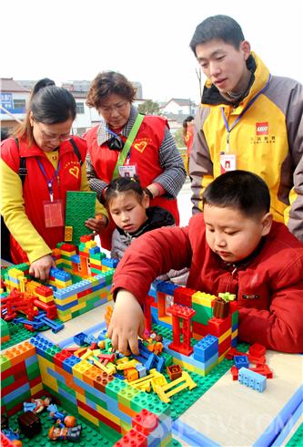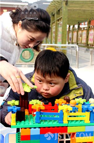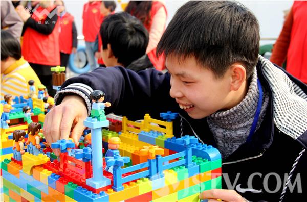 2016年3月25日,仪征市特殊学校游乐场,一群义工带着玩具和“折冀天使”们一起搭积木房屋游戏。 仪征市义工联当日组织义工志愿者和乐高教培中心一道,来到仪征市特殊学校和智障少年游戏、娱乐,让这群“折冀天使”们也能享受同龄人一样的花样年华。义工们还为“折冀天使”带来苹果、牛奶等食品,让孩子们分享童年快乐。