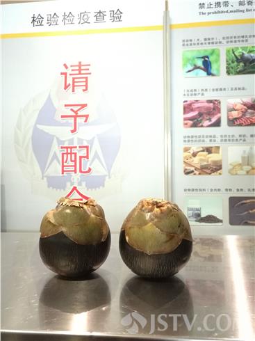 3月24日下午,南京机场检验检疫查验人员在入境航班携带物查验时发现两枚“炸弹果”,现场进行了没收处理。两枚“炸弹果”是一名旅客在印度购买,通过香港转机,进入中国。旅客的携带物品在通过机场X光机时被检验检疫人员发现。由于首次截获此类物品,检疫人员在询问旅客后,得知此为“炸弹果”。