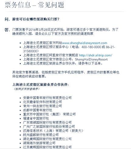 此外,为了避免网络购票扎堆,上海迪士尼度假区已经和六十多个旅游公司签署了合作协议,委托门票和酒店的销售和预定。记者先后登录阿里旅行、驴妈妈、携程等热门购票网站,17号以后的票都有售,价格也和迪士尼官网相同。如果消费者不放心门票的真伪,可以登录迪士尼官网,查询票务信息,只要在旅游业合作伙伴列表中,销售的都是真票。