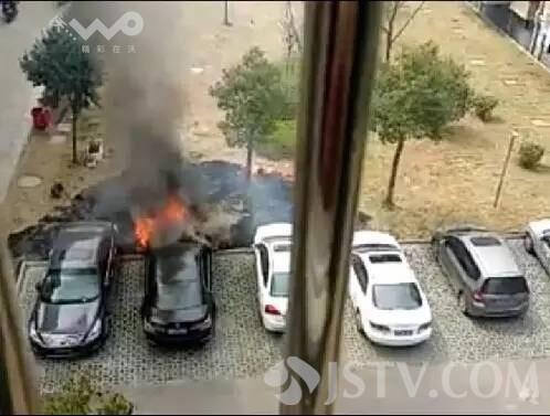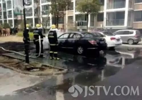 今天(3月31日)上午在兴化万嘉名城小区物管人员发现楼下汽车起火后,迅速带领安保队员携带灭火器赶到火灾现场进行扑救,并同时报119火警,并疾声呼喊燃烧车辆邻近汽车的车主尽快移走车辆。因黑色汽车火势较大、白色汽车车胎烧爆无法移走,后在消防队员的努力下,大火扑灭。