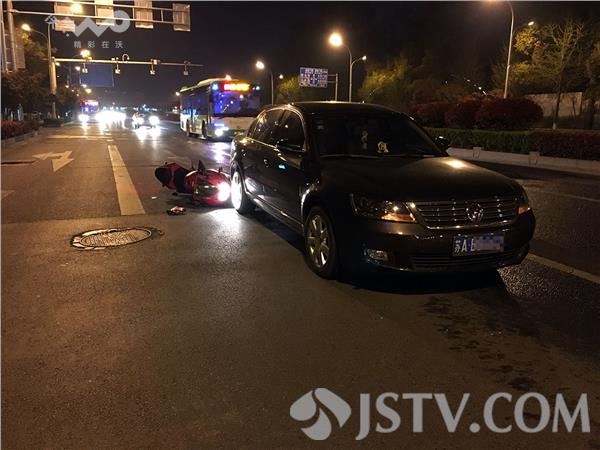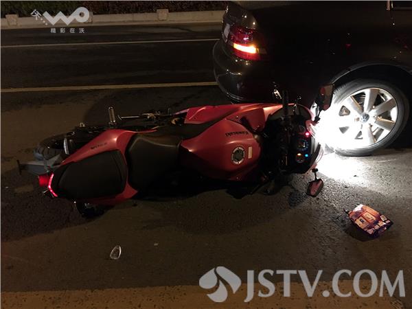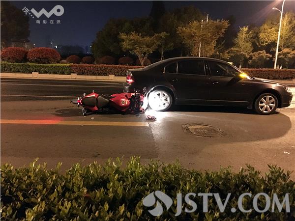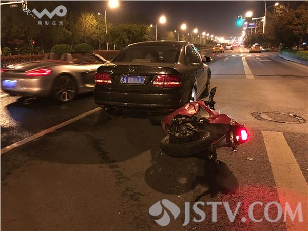 31日晚上9时许,在南京龙蟠路锁金村附近,由东向西方向,一对年轻情侣骑一辆四万多元的摩托车在路上行驶,因路面刚撒过水打滑追尾前方的一辆黑色轿车,摩托车随即倒地,钻入桑塔纳轿车右侧车底,幸好后方没有汽车紧跟,否则后果不堪设想,摩托车上两人从地上爬起,路过的市民看到惊恐场面纷纷围观,询问后得知好在两人只是受了皮外伤。