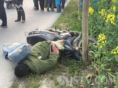 事发时,在道路的拐弯处,一中年男子骑摩托车和一骑电动的男子都准备转弯,摩托车快碰上电动车时,摩托车车主调转车方向,不幸撞上了路边的一棵树,由于摩托车的车速产生的动能在撞树后产生巨大的反弹力,摩托车手被弹飞了出去,头磕在水泥路的路牙上,当场死亡。现场十分惨烈,摩托车车手趴在路边一动不动,头盔掉在一旁,脸上流了一滩血。而电动车车主只是车稍微晃了一下,人无碍。