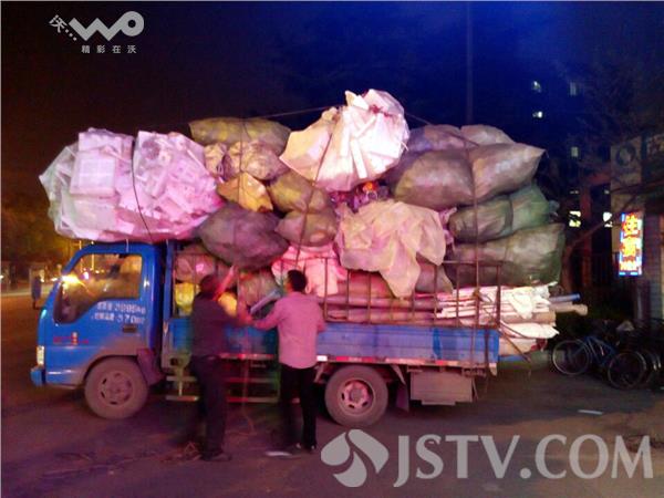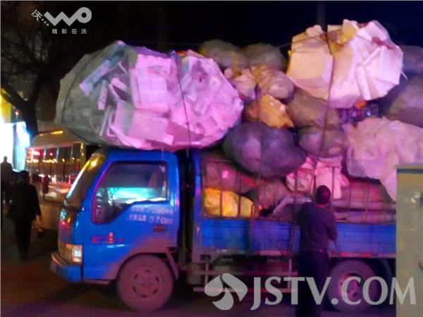 1日晚上,南京北安门街,一辆蓝色轻型货车拉了“顶天”一车的废品,废品高度甚至超出车头,像这样的货车在路上行驶,非常危险。