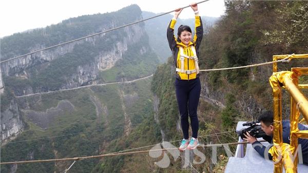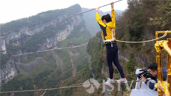 挂好保护锁、系好安全绳,我们记者就走上了选手即将走的钢丝,它的起点端是固定在天坑的悬崖峭壁上,对面山上的亭子,就是钢丝的终点。“这真的是人生绝无仅有的体验,100层楼高的视觉,我拿不了平衡杆儿,只好拽着上方的安全绳,走第一步,不是那么害怕,但是钢丝真的很细,脚根本找不到着力点啊!”