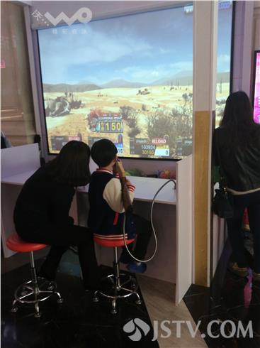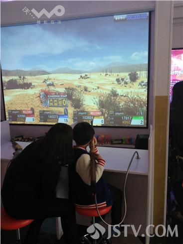 在新城市广场的三楼游戏展台前,不少儿童正在体验射击游戏。工作人员表示,这款游戏是韩国团队设计的,主要是模仿打猎场景,体验者可以花费20元购买80发子弹,手拿“猎枪”,射击屏幕虚拟场景中的各种野生动物。