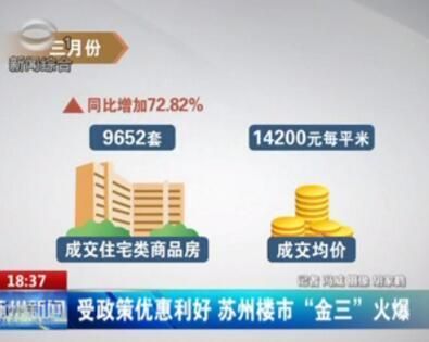 根据相关机构统计,三月份苏州共成交住宅类商品房9652套,同比增加72.82%。整体成交均价达到了14200元每平米,环比上涨5.79%。业内人士表示,苏州楼市的“量价齐升”主要是与今年2月份,国家先后出台政策,对房产交易税和首付比例进行优惠和下调有关。