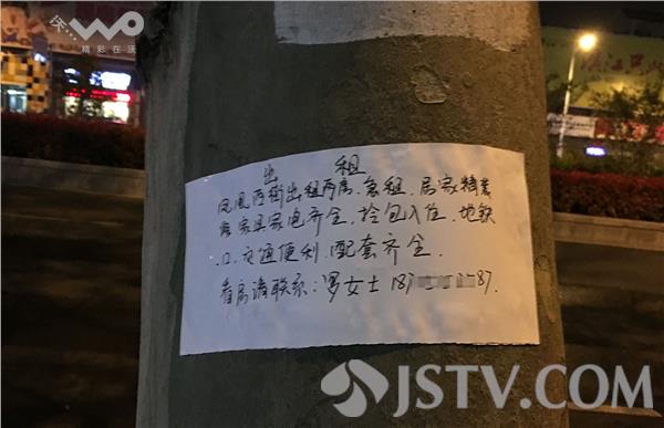 4月5日晚上8时许,在南京江东路水西门大街附近,一位穿着打扮时髦的年青女子,手上拿着一沓手写字的白纸条和胶棒,乘着夜色正在给梧桐树、电线杆上贴字条。经了解,她原来是一位房产中介公司的员工,冒充个人贴出租房源广告。