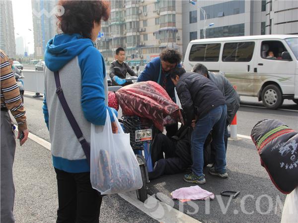 7日下午3点半左右,家住鼓楼区定淮大桥附近的一位大爷,像往常一样骑电动车载着老伴,老两口由西向东沿定淮大桥下桥行驶,不料,突然一下,两人都连人带车一起摔翻在地。