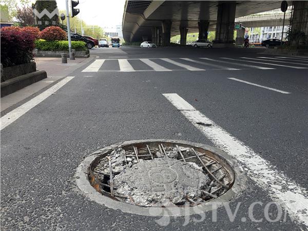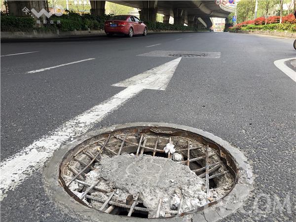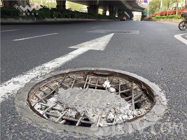 在南京快速内环模范西路与虎踞北路高架桥下的快车道上,一个1米左右直径的水泥窨阱盖被汽车压坏,水泥大部分脱落,周围裸露的钢筋锈迹斑斑,被压弯成锅底一样的弧形,汽车从上面轧过,容易扎破轮胎,危险重重,存在安全隐患。