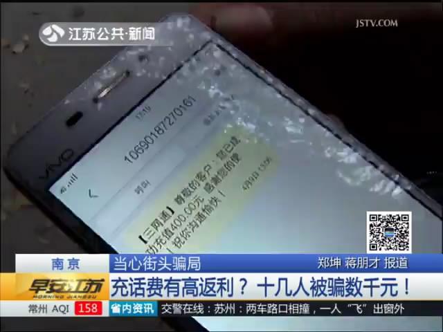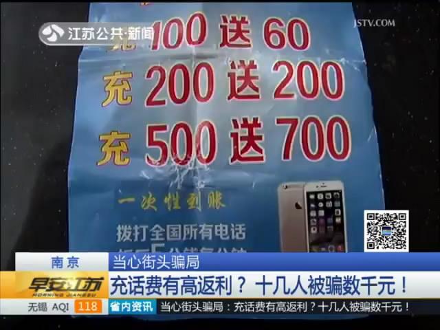 昨天下午五点多钟,有几个市民到南京市幕府山派出所报警,说他们下午在菜市场门口充话费,充值人员称,每充一次都有高额返利。但是几个小时过去了,市民们充的话费却仍然没有到账,而那些充值人员已经消失的无影无踪。