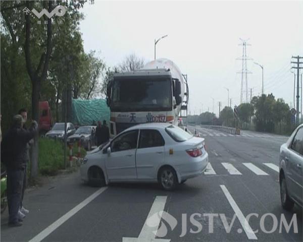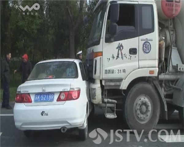 4月11日上午8时许,沿江高等级公路扬州仪征苏港大道四叉路口发生一起交通事故,一辆混凝土搅拌车和一辆广本小轿车相撞,小轿车撞击报废,驾驶员软组织受伤。