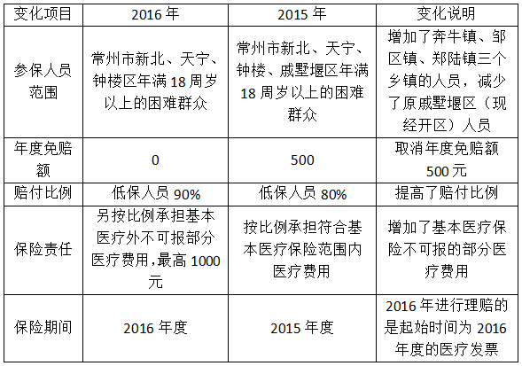 因区划调整,2016年度,奔牛镇、邹区镇、郑陆镇三个乡镇户籍人员纳入此次保险方案;原戚墅堰辖区(现经开区)所辖范围内的最低生活保障对象和低保边缘困难家庭成员不在此次保险范围,相关救助政策将由武进区慈善总会管辖。