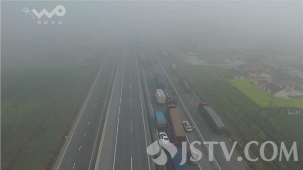 由于大雾天气加上发生交通事故,国道G228幸福大道上跨桥由南向北的车道发生拥堵,射阳当地的交警部门正在清理现场并疏导交通。