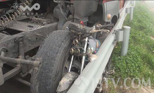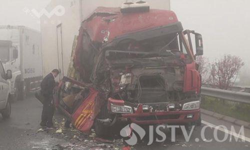 荔枝新闻通讯员赶到现场时,受伤的摩托车驾驶员已被120救护车接送到医院抢救,事故处理交警正在对现场进行勘查,由南向北的整个车道被堵死,积压车辆排起的长龙有两公里左右。记者在现场看到,一辆大货车头朝北停在车道里,整个驾驶室已经严重变形,挡风玻璃破碎脱落,保险杠断裂,右侧驾驶室门弯曲变形,前方不远处,一辆大货车靠边停在那里,车厢后部的保险杠弯曲,南侧,一辆厢式货车与一辆罐车咬在一起,所幸罐体没有受到撞击,而罐车与路边护栏的中间,还夹着一辆头朝南的逆向摩托车,摩托车的车头破损严重,南侧的路面上还有一滩血迹,显示摩托车驾驶员的受伤不轻。一名货车驾驶员告诉记者,当时因为雾太大,前方货车不知道什么原因停车了,来不及刹车就撞上去了。