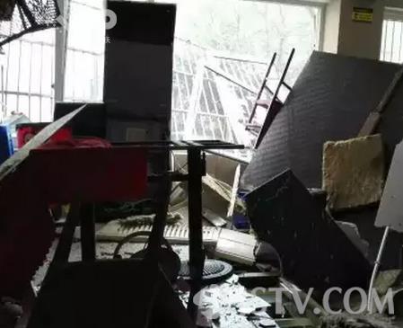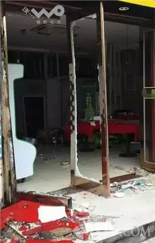 门窗玻璃全部碎裂,铝合金制的两扇门都变了形,店里一片狼藉。