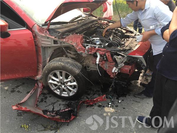 记者赶到现场时,老远就看到一辆红色的马自达轿车已经坠入在河中,轿车的前保险杠及引擎盖都被撞严重变形,散落在路边的河道中。在现场可以看到零部件散落一地,轿车的前挡风玻璃也破碎,轿车驾驶室里面的两个安全气囊已经打开。路边的路灯杆也被车撞倒,路灯和电线杆也被撞脱离。