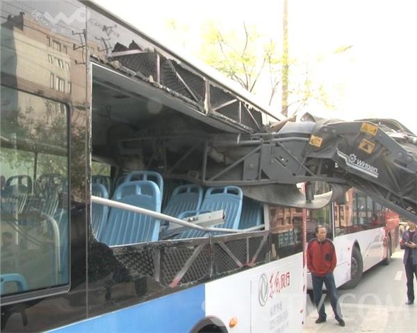 今天(4月13日)早上7点40左右,南京大厂葛关路发生起一起车祸,一辆施工铣刨机在转弯的时候,3米长的履带伸臂插入一辆正常行驶的618公交车中,造成公交车内多人受伤,其中五人伤势比较严重。