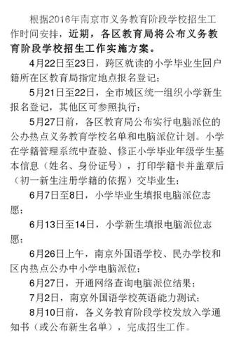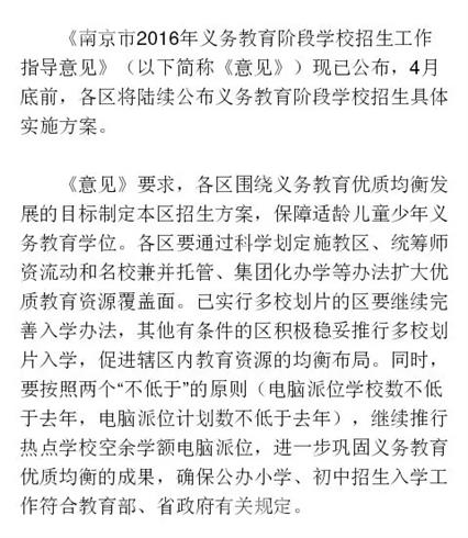 今天下午,南京市教育局发布了《南京市2016年义务教育阶段学校招生工作指导意见》(以下简称《意见》),4月底前,各区将陆续公布义务教育阶段学校招生具体实施方案。