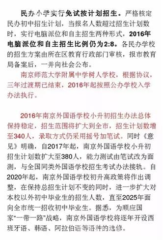 2、2016年南京外国语学校小升初招生办法总体保持稳定,招生范围将扩大到全市,招生计划数增至340人,录取方法仍采用摇号加笔试。