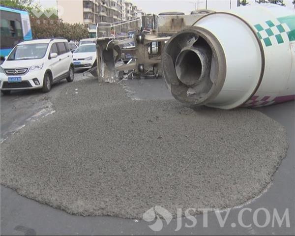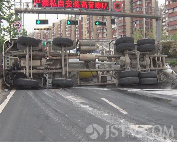 今天下午一点钟在南京幕府东路与五百村路口发生一起交通事故,一辆混凝土搅拌车为避让一辆小轿车,发生混凝土搅拌车侧翻,交通受阻长达2小时。