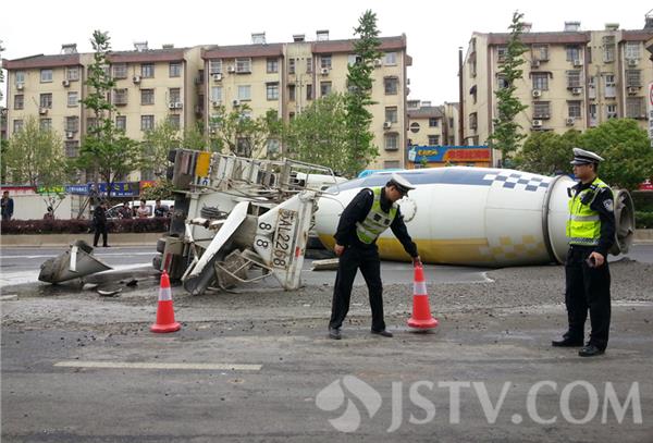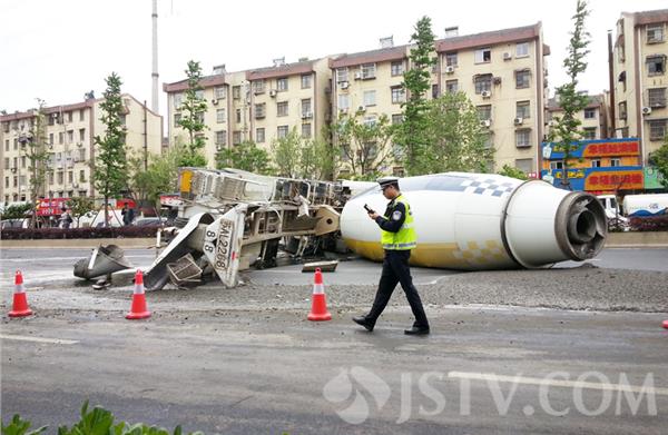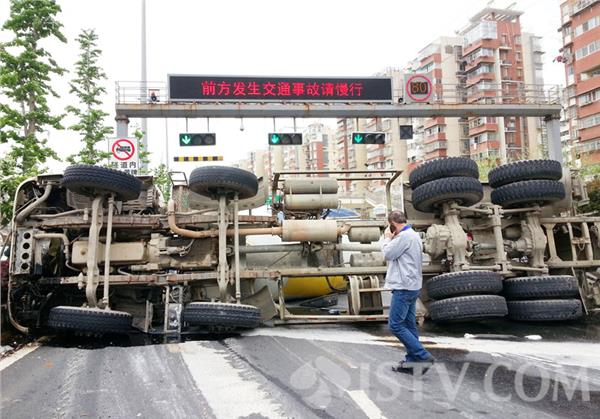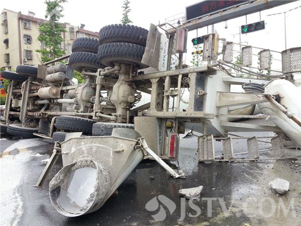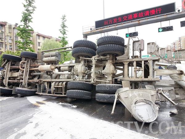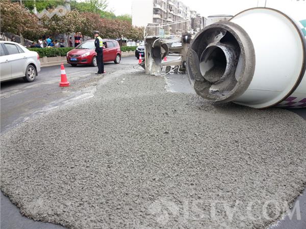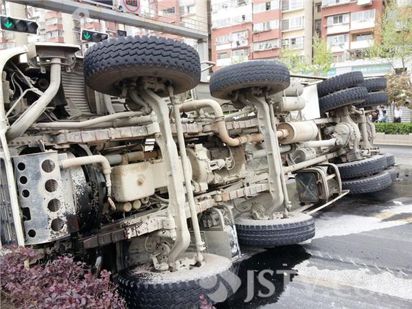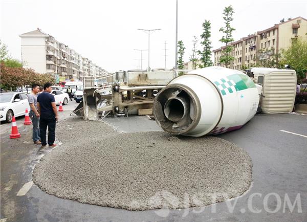 4月15日下午1点钟左右,在南京鼓楼区幕府东路五塘村隧道入口附近,一辆装满水泥砂浆、重达40多吨的槽罐车因为避让从右侧道路穿插上主道的私家车(此时私家车前面还有一辆洒水车在作业,导致私家车的速度比较慢),槽罐车司机急打方向盘,导致槽罐车一下子向右侧翻倒地,槽罐车的车头也撞上马路中间的水泥隔离带,随后槽罐车才停了下来。水泥砂浆泼洒一地,槽罐车驾驶室玻璃破裂,所幸驾驶室没有被挤压,司机也被众人从破损的驾驶室拖了出来,万幸的是司机只是腰部被划伤出血,真的是死里逃生。