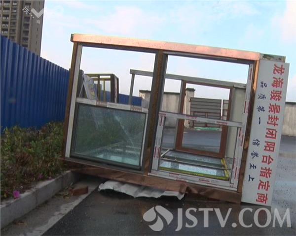 荔枝新闻记者在现场看到,这个刚刚交付时间不长的小区,一处10多米、长2米高的围墙挡板被大风刮飞出去10多米远,这名小区业主的轿车引擎盖上有几处被砸过的凹痕,轿车后视镜也被刮坏。轿车司机说,他下午将车子正常停放在这里,一阵大风过后,轿车被小区里的岗亭砸坏了,他当然要找物业了。小区物业辩解说,岗亭是装潢公司停放在小区里面的,轿车司机认为,装潢公司的岗亭没有物业批准,他们不敢停放在小区里面,所以,物业有着不可推卸的责任。随后,装潢公司负责人也赶到现场,承认岗亭是他们摆放的,但确实是经过小区物业同意的。现在轿车被倒伏的岗亭砸坏,他们愿意赔偿,就是车主提出的2000元赔偿数额有点高了,希望车主往下降一点。最终,在民警的协调下,车主做了让步,装潢公司和小区物业共同赔偿车主1000多元。民警提醒,市民平时要多关注天气预报,一旦遇到大风等恶劣天气,一定要检查好摆放在室外的物品是否安全,以免意外发生。
