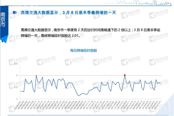 南京市一季度高峰拥堵延时指数 1.68 ,即高峰出行时间是畅通状态下的 1.68 倍,高峰平均行车 速度 27.73km/h。