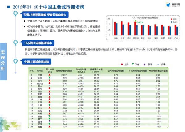 4月20日,国内领先的数字地图、导航和位置服务解决方案提供商高德地图联合清华大学戴姆勒可持续交通研究中心正式发布了《2016年第一季度中国主要城市交通分析报告》。报告显示,受春节返乡影响,今年一季度全国城市拥堵大幅缓解,其中一线城市下降最明显。