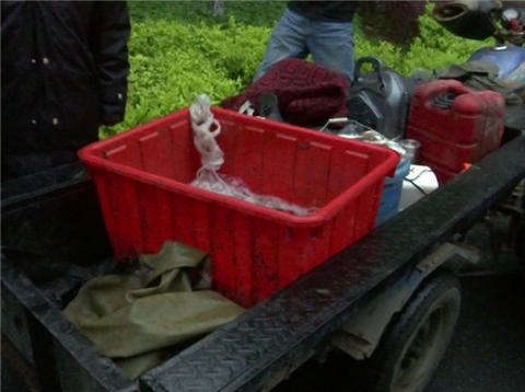 短短的十秒钟时间,嫌疑人伴随着马达的轰鸣声已经消失不见,就当大家有点失望时,另一名犯罪嫌疑人试图从原路逃脱,被执法队员两面夹击,一举拿下。记者看到,这辆三轮车上红色框内开着增氧泵,大大小小的鱼多达七八十条。