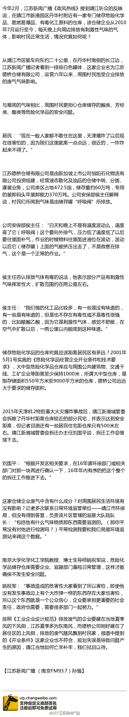 今年2月,江苏新闻广播《政风热线》接到靖江听众的反映说,在靖江市新港园区丹华村附近有一家专门储存危险化学品、易燃易爆品、有毒化工原料的仓库,该仓储企业从2010年7月运行至今,每天晚上向周边排放有刺激性气味的气体,影响村民正常生活。下图为当时报道原文。