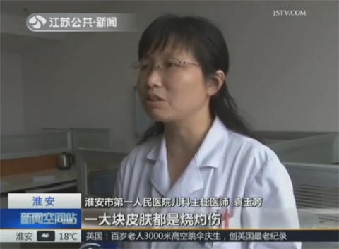 淮安市第一人民医院儿科主任医师袁玉芳回忆道,当时这个孩子全身酸味特别浓,整个病房里面全是醋酸的味,而且孩子的颈部胸前部分一大块皮肤都有烧灼伤。