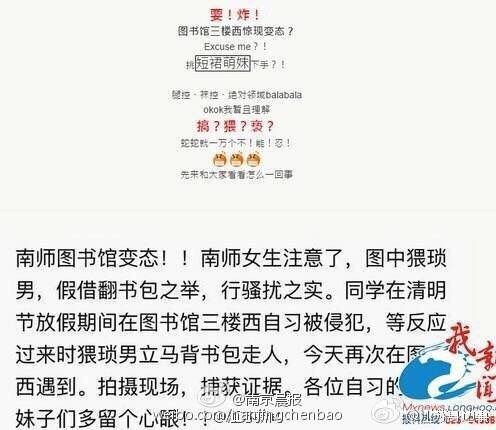 据网友爆料,南师大仙林校区敬文图书馆内出现一名裙底色狼,此人侵犯过多名女同学,都是借转身翻书包之便,伸手摸女生裙底,被发现后即刻背上书包逃离现场。有同学称已在图书馆多个楼层发现该男子,推测应为老手,非初犯。
