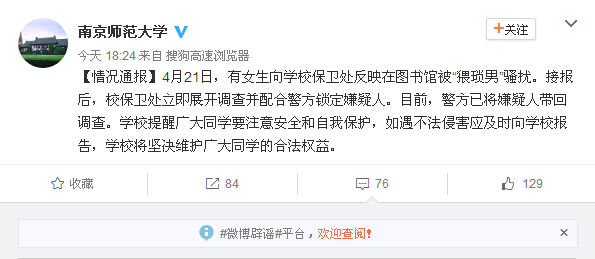 南京师范大学晚间回应称,4月21日,有女生向学校保卫处反映在图书馆被“猥琐男”骚扰。接报后,校保卫处立即展开调查并配合警方锁定嫌疑人。目前,警方已将嫌疑人带回调查。学校提醒广大同学要注意安全和自我保护,如遇不法侵害应及时向学校报告,学校将坚决维护广大同学的合法权益。