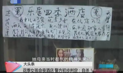 虽然疑点重重,但警方判定女孩系自杀。 家人未见到女孩最后一面,在酒店门口摆花圈讨说法,要求酒店老板出面给出合理解释,女孩母亲失去爱女精神失常。